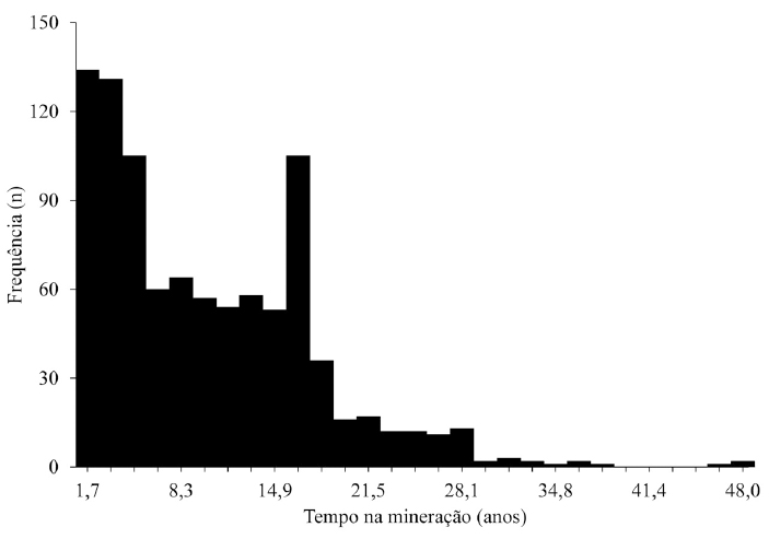 Sabe-se que a dose cumulativa de poeira inalada é formada por dois componentes principais: a duração da exposição e a concentração de poeira1),(13. No componente representado pela duração da exposição, com relação ao tempo de trabalho na mineração estudada (Figura 2), observou-se que a maior parte dos trabalhadores (58,5%) teve tempo de exposição até 10 anos, sendo que 75,5% não atingiram o tempo mínimo previsto em lei para a aposentadoria especial de trabalhadores em subterrâneo de minas, que é de 15 anos. Alguns alternaram períodos de trabalho na superfície com períodos de trabalho no subterrâneo. É perceptível a presença de trabalhadores com períodos muito curtos de trabalho na mineração de ouro, como os 38,9% que trabalharam por menos de 5 anos.