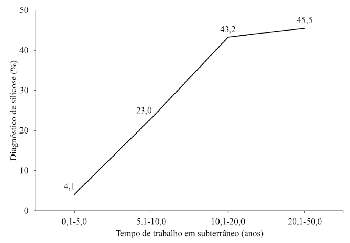 Resultados: o diagnóstico de silicose foi confirmado em 19,7% dos avaliados. Nenhum caso da doença foi identificado em indivíduos que trabalharam apenas na superfície. A prevalência no grupo que trabalhou até 5 anos no subterrâneo foi de 3,8% e no grupo com mais de 20 anos de trabalho nesse local foi de 44,2%. Os admitidos para trabalho subterrâneo até 1950 apresentaram prevalência de 57,9%. Entre os admitidos após 1990, não houve registro de casos.