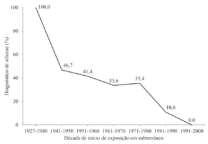 Conclusão: verificou-se uma queda expressiva na ocorrência de silicose no período analisado. Uma vez que a doença é sabidamente dose-dependente, é esperado que a diminuição dos níveis de exposição, obtido pelas melhorias dos ambientes ocupacionais, tenha refletido nestes resultados. É fundamental que tais medidas continuem a ser adotadas na mineração e em outros ramos de atividade visando reduzir a ocorrência da doença.