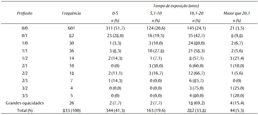 A Tabela 1 apresenta a frequência das 12 subcategorias radiológicas. Por motivo de ordem prática, a subcategoria 0/- foi incluída na 0/0, assim como a 3/+ foi incluída na 3/3. Nessa distribuição não foram considerados os resultados de tomografias. Os portadores de grandes opacidades foram registrados separadamente. O tempo de exposição em subterrâneo foi dividido em quatro faixas de duração (até 5 anos; de 5,1 a 10 anos; de 10,1 a 20 anos e maior que 20 anos). O maior subgrupo estava na faixa mais baixa de exposição (até 5 anos), composto por 311 indivíduos com classificação radiológica 0/0. Nesse subgrupo concentraram-se aqueles nos quais a tomografia não foi considerada necessária, dado a forte característica dose-resposta da doença. Ressalta-se que, entre esses, 164 tinham menos de 2 anos de exposição. Nota-se que, a partir da subcategoria 3/2, todos tinham tempo maior que 10 anos.