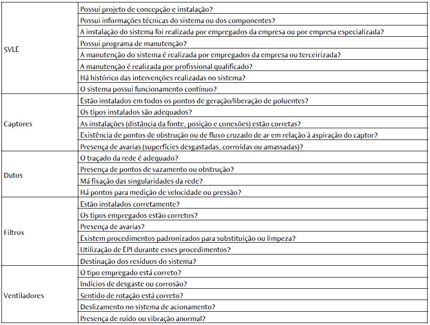 Resultados: as etapas de inspeção e avaliação dos parâmetros do SVLE apontaram deficiências no projeto, na operação e na manutenção do sistema, referendadas por sua reduzida velocidade de captura. Na avaliação ambiental, foram encontradas concentrações de sílica cristalina na fração respirável acima do valor de referência adotado.