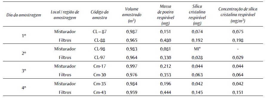 Na última etapa, foi avaliada a concentração de sílica cristalina na fração respirável na região do posto de trabalho do misturador de sílica e silicone, e nas proximidades dos filtros do SVLE. De acordo com Ojima20, a eficácia de um SVLE pode ser determinada a partir da avaliação da concentração de poeira de sílica cristalina presente na área de captação do sistema.