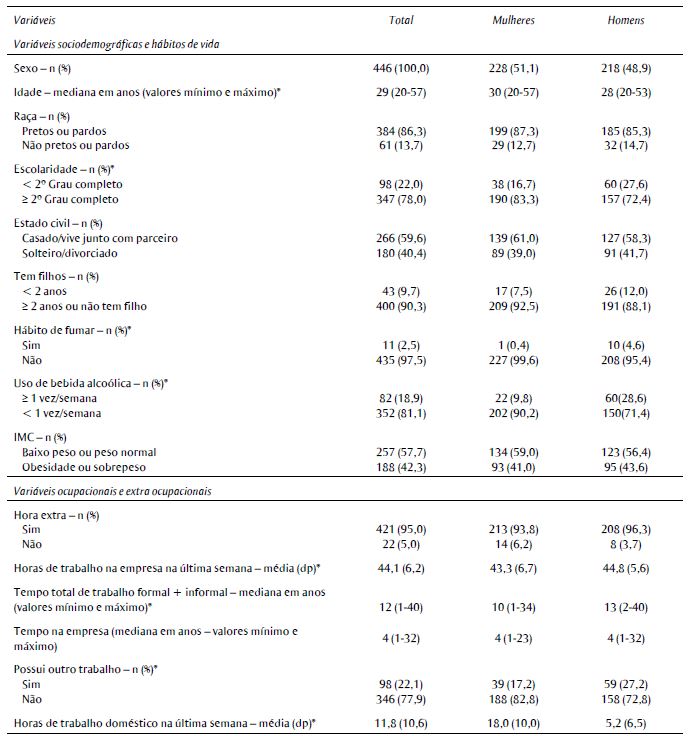 Foram estudados 446 trabalhadores, 228 mulheres (51,1%) e 218 homens (48,9%). A mediana da idade foi de 29 anos, sendo a mínima 20 anos e a máxima 57. Cerca de 86% reconheceram-se pretos ou pardos. Os indivíduos com pelo menos o segundo grau completo eram 78%, e um pouco mais da metade da população (59,6%) era casada ou vivia junto com um parceiro e 9,7% tinham filhos menores de dois anos de idade. A proporção de fumantes foi 2,5% e o consumo de álcool com frequência de uma vez por semana ou mais foi registrado por 18,9% dos trabalhadores. Com base no IMC, 42,3% apresentavam sobrepeso ou obesidade (Tabela 1).