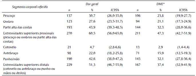 A Tabela 2 mostra a prevalência de dor geral e de dor musculoesquelética que atendeu aos critérios de duração, frequência e gravidade, referidos neste estudo como DME (definição de caso na seção Métodos), para os segmentos corporais em estudo. As prevalências foram de 60,5% para pescoço ou ombros ou parte alta das costas e de 51,3% para extremidades superiores distais (cotovelo ou antebraço ou punho ou mãos ou dedos). Já a prevalência de DMEPOC foi 47,3% e de DMECAP foi 37,4%.
