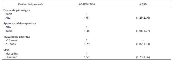 A análise de regressão mostrou associação entre DMEPOC e sexo, sendo que as mulheres apresentaram 1,55 vezes a prevalência de DME dos homens (IC95%: 1,23-1,96). Os DME foram 63% mais frequentes entre os expostos a alta demanda psicológica comparados aos não expostos (1,63, IC95%: 1,29-2,06). Houve associação, também, entre esses distúrbios, baixo apoio social do supervisor e tempo de trabalho na empresa ≥ 8 anos (Tabela 3).