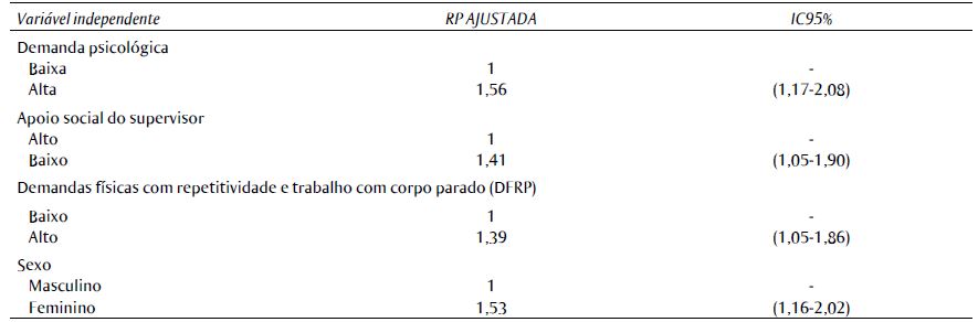 A prevalência de DMECAP entre mulheres foi 1,53 vezes a prevalência entre os homens (IC95%: 1,16-2,02). Os trabalhadores expostos a alta demanda psicológica apresentaram 56% mais DME quando comparados aos não expostos (IC95%: 1,17-2,08). Existiram, ainda, associações desses DME com demandas físicas caracterizadas pela repetitividade e trabalho de corpo parado (DFRP) e com baixo apoio social do supervisor (Tabela 4).