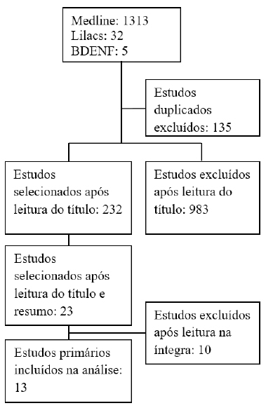 Na terceira etapa realizou-se a leitura na íntegra desses 23 artigos, sendo retirados 10 que não atendiam aos critérios de inclusão e não respondiam à questão norteadora desta revisão, de modo que ao final restaram 13 artigos. A Figura 1 ilustra o processo de seleção dos artigos desta revisão integrativa.
