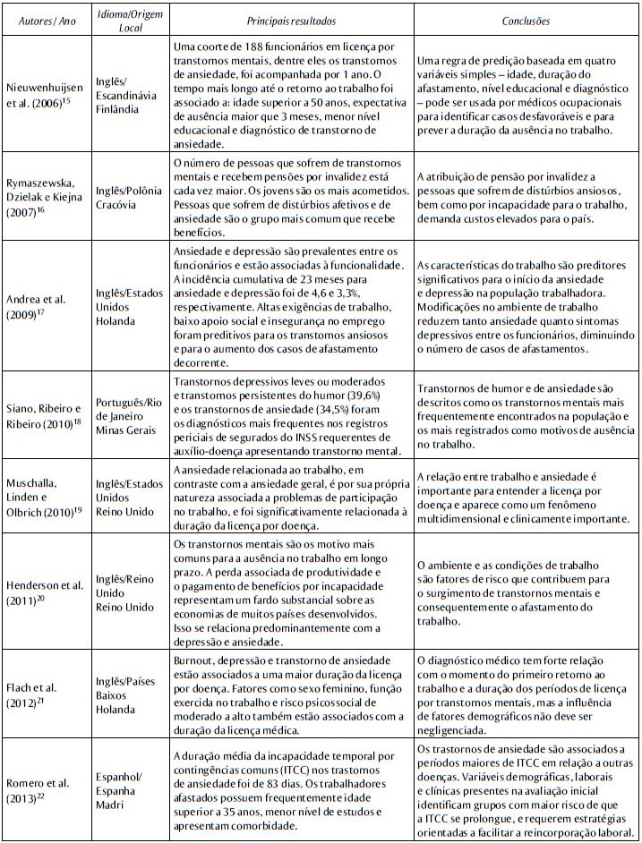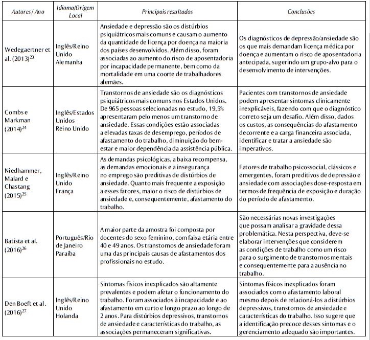 Resultados: a seleção final consistiu em 13 artigos, sendo o mais antigo publicado em 2006 e o mais recente em 2016. Os afastamentos por transtornos de ansiedade tiveram como principais fatores de risco as condições e ambiente de trabalho, com impacto negativo, tanto para a saúde do trabalhador como para o empregador.