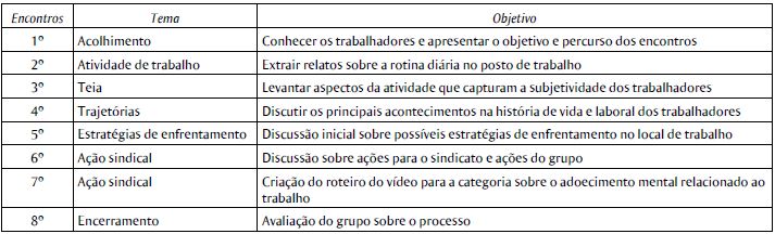 As reuniões ocorreram na sede do Sindicato dos Bancários de Limeira, com três objetivos principais: acolher os trabalhadores que se encontravam em sofrimento relacionado ao trabalho; auxiliar a compreensão dos mesmos sobre o processo de sofrimento, compreendendo como esse se deu e sua relação com o trabalho; identificar, fortalecer e criar novas estratégias de enfrentamento individuais e coletivas. Para atingir os objetivos, cada encontro buscou motivar os participantes por meio de recursos orais e visuais sobre o adoecimento na categoria, com base em pesquisa bibliográfica em livros e artigos científicos1), (8), (10), (12), (16.