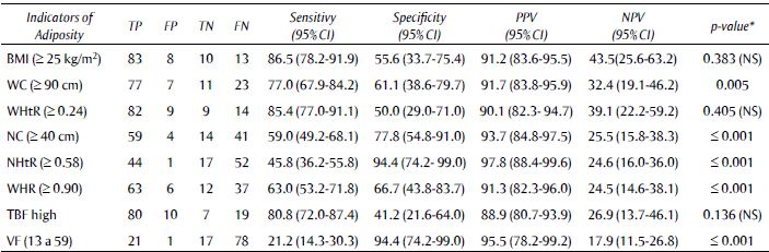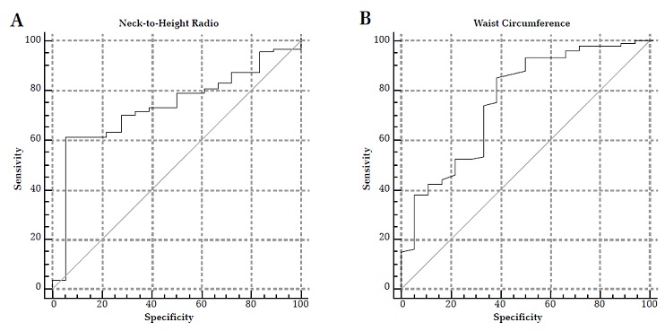 Conclusions: alterations in abdomen and neck adiposity indicators have a significant relationship with the presence of OSA and showed effectiveness as a screening method for PSG. WC and NHtR are considered good indicators for OSA prediction.