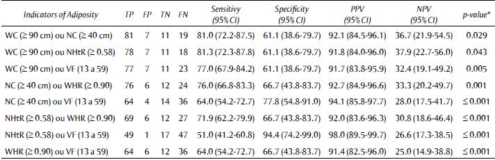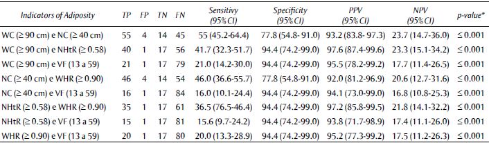 VPP superiores a 97% para os indicadores de adiposidade em combinações seriais também foram observados para CC e RPE (RPE e RCQ anormais; Tabela 3). Assim, o uso dos indicadores CC e RPE em combinações paralelas ou seriais foi o melhor para prever a AOS.