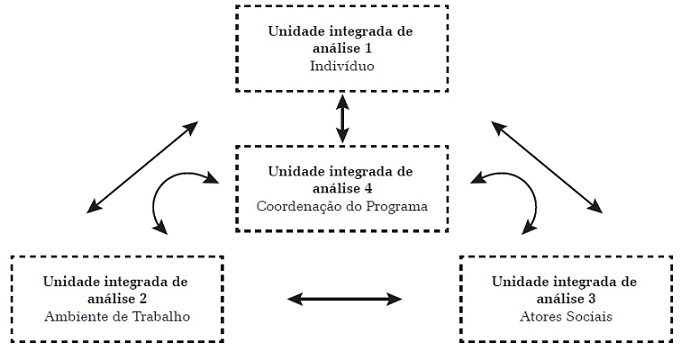 Os dados empíricos foram sistematizados segundo as orientações contidas no guia de desenvolvimento de modelos lógicos da Fundação Kellogg20, em matrizes descritivas preliminares contendo as ações, atividades, resultados esperados e processo de implantação do programa. A partir dessas matrizes foi possível identificar que o PRT-Cesat/Bahia desenvolveu ações direcionadas ao trabalhador (indivíduo), ao ambiente de trabalho e aos atores sociais, sendo mediadas pela coordenação do programa. A Etapa 2, “Categorização dos dados em unidades de análise”, foi desenvolvida a partir da perspectiva de Yin21 sobre a metodologia do estudo de caso único com unidades integradas de análise. Os autores perceberam que para a ampla compreensão e identificação dos componentes do programa e de suas interações era preciso tomar o PRT-Cesat/Bahia como unidade principal (o caso) e quatro unidades integradas de análise21 (Figura 1). Para cada uma dessas unidades de análise foi construída uma matriz descritiva contendo os insumos, atividades, produtos, resultados e impactos do programa20.