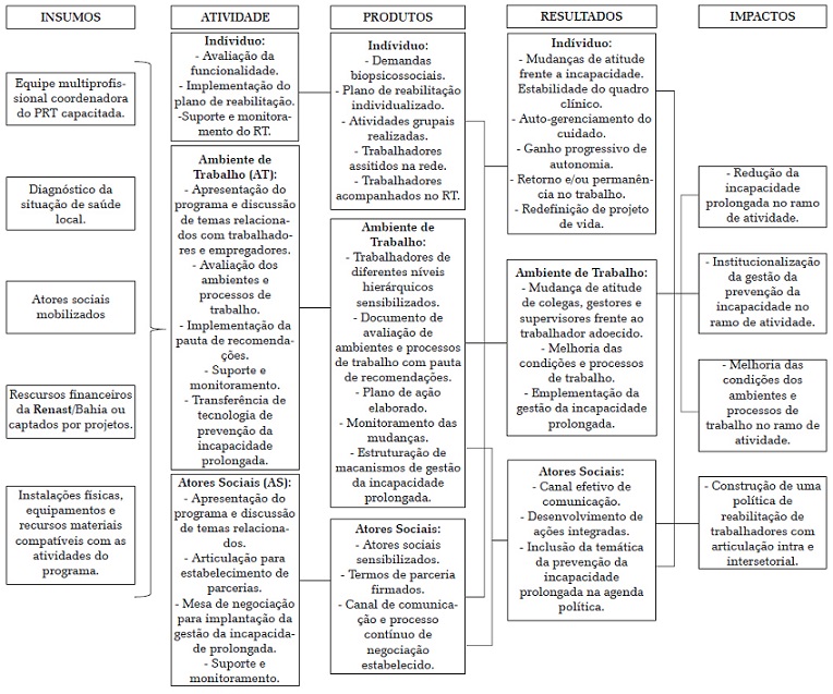 A decisão de elaborar o Modelo Lógico desse programa surgiu da necessidade prática e da pesquisa em avaliação de programas para se obter um instrumento orientador que visasse uma discussão mais aprofundada a respeito da disseminação desse tipo de intervenção na Rede Nacional de Atenção Integral à Saúde do Trabalhador (Renast) - tendo em vista a implantação da Política Nacional de Saúde do Trabalhador e da Trabalhadora (PNSTT). Portanto, o objetivo deste estudo foi construir o modelo lógico do PRT-Cesat/Bahia como uma ferramenta de avaliação do Programa para compreender melhor a intervenção multicomponente - que inclui ações de caráter clínico e não clínico -, para o manejo e prevenção da incapacidade prolongada dos trabalhadores com LER/DORT.