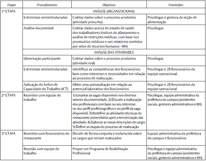 A intervenção foi organizada em três etapas. Na primeira etapa do processo foi realizada uma análise organizacional em que foram realizadas entrevistas semiestruturadas com a chefe da equipe técnica e análise documental, com o objetivo de coletar dados acerca do estado de saúde dos trabalhadores. Foram analisados os índices de afastamento e a descrição das restrições médicas da equipe operacional. Para a análise das atividades, foram realizadas entrevistas semiestruturadas com 28 funcionários e aplicação do Índice de Capacidade do Trabalho (ICT), de forma a identificar as principais competências de cada funcionário e obter uma autoavaliação em relação a seu potencial laborativo, bem como interesses e necessidades em relação ao processo de realocação. Os demais funcionários da equipe técnica (quatro funcionários), apesar de terem concordado em participar da pesquisa, estavam afastados do trabalho ou em período de férias durante a coleta de dados, o que inviabilizou a participação nesta etapa da pesquisa. Também foram realizadas observações participantes das atividades do setor produtivo.