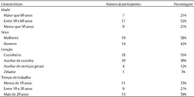 Os dados descritos neste estudo são referentes aos 33 funcionários que concordaram com a participação na pesquisa, destes, 32 eram da equipe técnica e um era zelador. Um funcionário da equipe técnica não concordou em participar da pesquisa. Foram excluídos deste processo de coleta de dados os membros da equipe de gestão e do administrativo, pois não se enquadravam na demanda trazida pela equipe de gestão do restaurante.