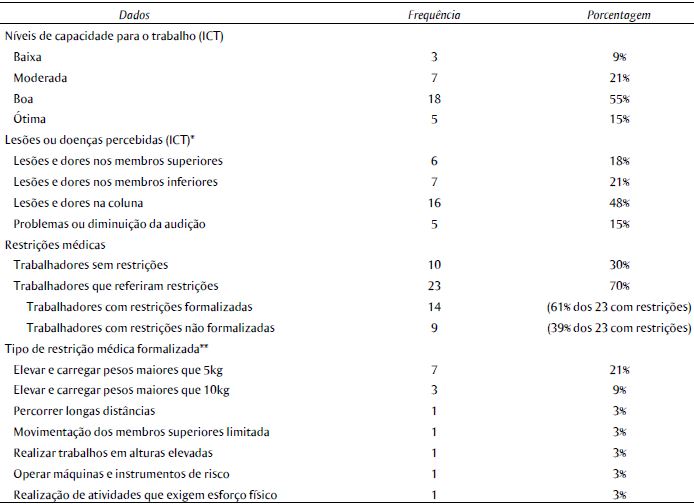 Quanto aos dados referentes ao estado de saúde dos funcionários, nas entrevistas foram identificadas disparidades entre a restrição percebida e relatada pelos funcionários e as restrições efetivamente formalizadas por médico do trabalho. Dos 33 funcionários, 14 possuíam restrições formalizadas pelo serviço médico da universidade, ou haviam passado por um período de afastamento pelo Instituto Nacional do Seguro Social (INSS) que resultou em formalização de restrições médicas após o retorno ao trabalho. Três trabalhadores estavam temporariamente afastados de suas funções devido a problemas de saúde. Outros 9 relataram apresentar restrições não formalizadas que na sua avaliação interferiam na realização de atividades no serviço, ou seja, 70% do quadro de funcionários referiu restrições físicas para realizar suas atividades. Estes dados estão apresentados na Tabela 2, bem como os resultados referentes à aplicação do ICT.