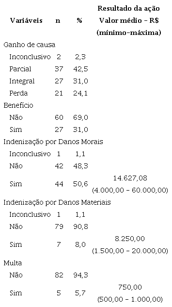 Os resultados demonstraram um longo período para a conclusão das ações movidas - 4 a 17 anos -, em sua maioria, movidas por profissionais do ramo de Telefonia (59,8%), seguido pela Educação (21,8%). Houve indenização por danos morais (50,6%), ganho de causa parcial (42,5%), reconhecimento do nexo causal entre trabalho e doença (39,1%), multa ao empregador (5,7%) e indenização por danos materiais (8,0%). O ganho da causa é parcial quando o Poder Judiciário atende a uma parcela das solicitações realizadas pelo trabalhador no decorrer da decisão judicial.