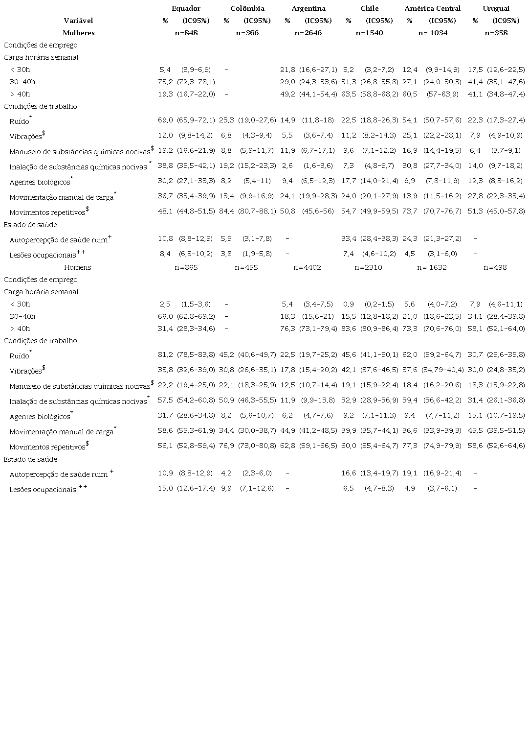 Em relação a condições de emprego, no Equador, 19,3% (IC95%: 16,7% - 22,0%) das mulheres e 31,4% (IC95%: 28,3% - 34,6%) dos homens trabalhavam mais de 40 horas por semana, os menores percentuais da região (por exemplo, comparado com o Chile: 63,5% das mulheres e 83,6% dos homens). Considerando as condições de trabalho, a exposição a ruído foi o risco mais prevalente entre os trabalhadores equatorianos: 81,2% (IC95%: 78,5% - 83,8%) dos homens e 69,0% (IC95%: 65,9% -72,1%) das mulheres, seguido de movimentos repetitivos: 56,1% (IC95%: 52,8% -59,4%) e 48,1% (IC95%: 44,8% - 51,5%), respectivamente. Em todos os países, a frequência de exposição a risco foi maior entre os homens (Tabela 2). Além disso, tal exposição foi maior comparando os resultados de Equador com a de outros países da região; por exemplo, na América Central, a exposição a ruído foi de 54,1% para mulheres e 62,0% para homens; a substâncias químicas no ar foi de 30,8% e 39,4%, respectivamente, e a agentes biológicos foi de 9,9% e 9,4%, respectivamente.