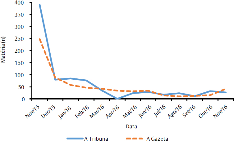 Como também pode ser observado na Figura 1, o tema não saiu da pauta ao longo do ano, com exceção do mês de abril de 2016, quando não houve registro de matéria sobre o tema no Jornal A Tribuna. A diminuição de matérias pode ser justificada pela cultura jornalística que valoriza os acontecimentos extraordinários, relacionada com a noticiabilidade. Esse conceito é definido como o “conjunto de critérios e operações que fornecem a aptidão de merecer um tratamento jornalístico, isto é, possuir valor como notícia” (18. Desta forma, a partir da leitura do cenário durante os primeiros meses da cobertura analisada, foi possível verificar que a medida que o tempo foi passando, outros assuntos ganharam mais destaque e ocuparam a pauta dos jornais: os escândalos de corrupção e a abertura de impeachment da Presidente Dilma, a epidemia de Zika, a seca no Brasil, as Olimpíadas, entre outros temas.