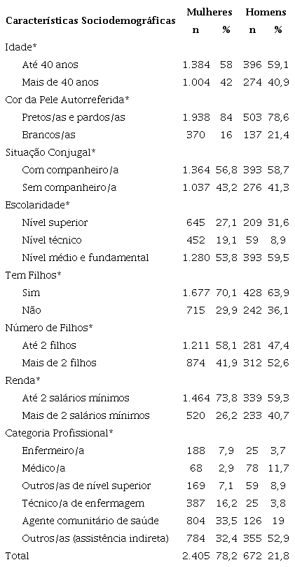 Dos/as 3.084 participantes do estudo multicêntrico, perdeu-se informação de sete indivíduos, referente à variável sexo, incluindo-se neste estudo, 3.077 trabalhadores(as). Destes, 84,5% atuavam na atenção básica e 78,2% eram mulheres, dentre as quais predominaram as jovens (58%), pretas e pardas (84%), com companheiro/a (56,8%) e com filhos/as (70,1%). Quanto à categoria profissional, prevaleceram as agentes comunitárias de saúde (33,5%) e outras relacionadas à assistência indireta (32,4%) que englobou os/as seguintes profissionais: pessoal administrativo, técnicas de nível médio, vigilantes, motoristas e trabalhadoras de serviços gerais. Entre os homens essas características também foram mais prevalentes, com exceção da categoria profissional na qual 11,7% deles eram médicos (Tabela 1). A insatisfação global com o trabalho entre os homens foi de 27,4%, e, entre as mulheres, foi um pouco menor, 25,6% (Figura 1).