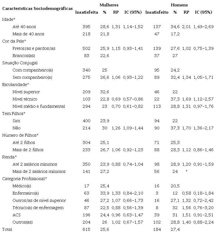 Na análise bivariada, a insatisfação com o trabalho associou-se, a níveis estatisticamente significantes, aos fatores sociodemográficos e às características do trabalho tanto para mulheres como para os homens (Tabelas 2 e 3).