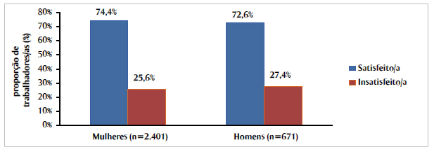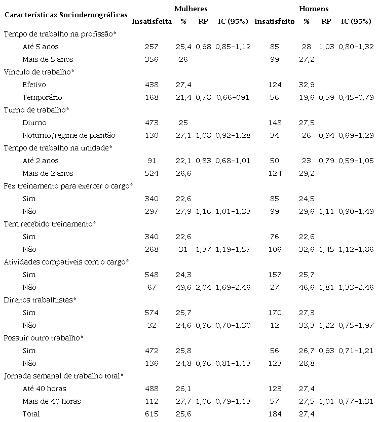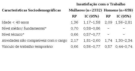 Resultados: a insatisfação com o trabalho entre homens foi de 27,4%, entre mulheres, 25,6%. Nas mulheres, mostraram-se associadas à insatisfação: idade até 40 anos (razão de prevalência - RP: 1,36; intervalo de confiança de 95% - IC 95%: 1,17-1,58), nível de escolaridade técnico (RP: 0,70; IC 95%: 0,58-0,86), e médio/fundamental (RP: 0,66; IC 95%: 0,57-0,77), vínculo de trabalho temporário (RP: 0,66; IC 95%: 0,56-0,77) e exercer atividades não compatíveis com o cargo (RP: 2,17; IC 95%: 1,81-2,60). Para os homens: idade até 40 anos (RP: 2,09; IC 95%: 1,56-2,81), exercer atividades não compatíveis com o cargo (RP:1,74; IC 95%: 1,30-2,34) e vínculo de trabalho temporário (RP:0,57; IC 95%: 0,44 - 0,74).