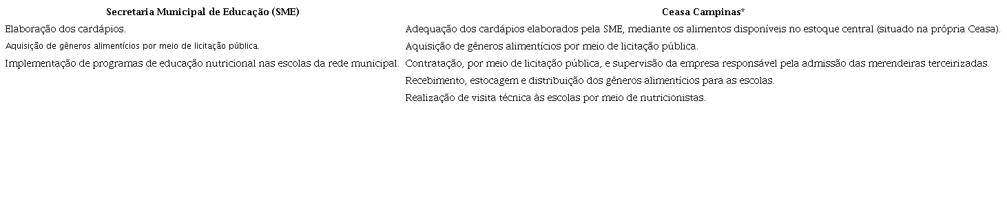 No município de Campinas, estado de São Paulo, o processo de descentralização do programa de alimentação escolar ocorreu no ano de 1984. Atualmente, a gestão do programa ocorre de forma compartilhada, por meio de um convênio entre a Secretaria Municipal de Educação (SME) e a Centrais de Abastecimento de Campinas (Ceasa Campinas)22, conforme observado no Quadro 1.