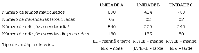 As unidades escolares estudadas apresentaram diferentes realidades quanto ao programa de alimentação escolar. Na escola A, localizada na região noroeste do município de Campinas, era servida apenas uma refeição por período de aula. Já nas escolas B e C, localizadas nas regiões leste e central, respectivamente, além da alimentação de cada período, era servido o almoço, que poderia ser consumido tanto pelos alunos do período matutino quanto pelos do vespertino. A escola C ainda oferece a opção de café da manhã aos alunos do período matutino, justificando esta refeição pelo fato da maioria dos alunos morarem distante da escola.