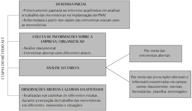 Na primeira fase, ocorrida durante o segundo semestre de 2017, foram utilizadas algumas etapas do método de análise ergonômica do trabalho (AET). A AET é um método aberto e sem modelo de ação predeterminado, o que possibilita a utilização de diferentes ferramentas, uma vez que sua escolha é feita em função das peculiaridades dos problemas que surgem durante sua aplicação21. Assim, neste estudo utilizou-se uma adaptação do método visando a construção do caminho que conduzisse a pesquisa para o mais próximo dos objetivos propostos, não aplicando-se na íntegra suas etapas. A adaptação da AET realizada na primeira fase da pesquisa (Escola A) se deu por meio da concretização das etapas descritas na Figura 1.