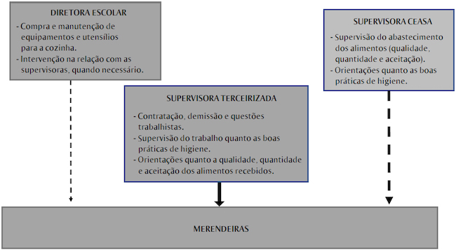 Na forma como está organizada a gestão compartilhada, entendemos que o trabalho das merendeiras está tanto subordinado a duas supervisoras oficiais, como a diretora da escola, de forma não oficial.