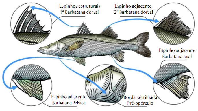 Espécies de robalos são comuns no estado do Maranhão, Nordeste do Brasil. Os nomes científicos dessas espécies são Centropomus parallelus (Poey, 1860), C. pectinatus (Poey, 1860) e C. undecimalis (Bloch, 1792). São popularmente conhecidas como camurim branco, camurim e camurim preto, respectivamente10. Esses peixes pertencem à família Centropomidae e vivem em ambientes marinhos e de água doce, em águas tropicais e subtropicais11. Por serem um excelente recurso pesqueiro, graças ao seu sabor e ao valor comercial, as espécies de robalos tornaram-se alvo da pesca artesanal na região12. Morfologicamente, os robalos possuem espinhos (espículas) que sustentam suas nadadeiras11. Esses espinhos podem causar traumas em humanos por meio de perfuração.