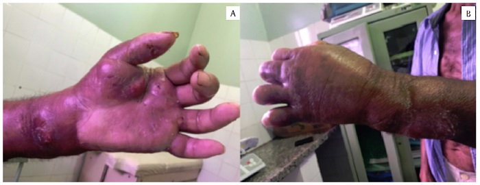 Após 10 dias sem resposta positiva, foi adicionada Gentamicina 80 mg 12/12h ao tratamento. Após 26 dias de internação, o uso de antibióticos foi suspenso, sendo administrados apenas medicamentos para o tratamento dos principais sintomas (analgésico, antiemético, protetor gástrico, anti-inflamatório e anti-hipertensivo). O paciente ficou estabilizado, apresentando redução significativa da secreção da lesão, edema de mão e recuperação dos movimentos dos dedos. O hemograma foi repetido, confirmando que o quadro havia melhorado. Após 32 dias de hospitalização, o paciente finalmente recebeu alta, com orientações para acompanhamento ambulatorial e profilaxia de lesões, baseada em solução salina, pomada de neomicina, algodão e esparadrapo. Dois meses após o acidente, o pescador procurou mais uma vez atendimento médico. Além do processo inflamatório, o paciente apresentava edema e eritema em membro superior esquerdo, do antebraço até a extremidade distal, com limitação de movimentação dos dedos (Figura 2).