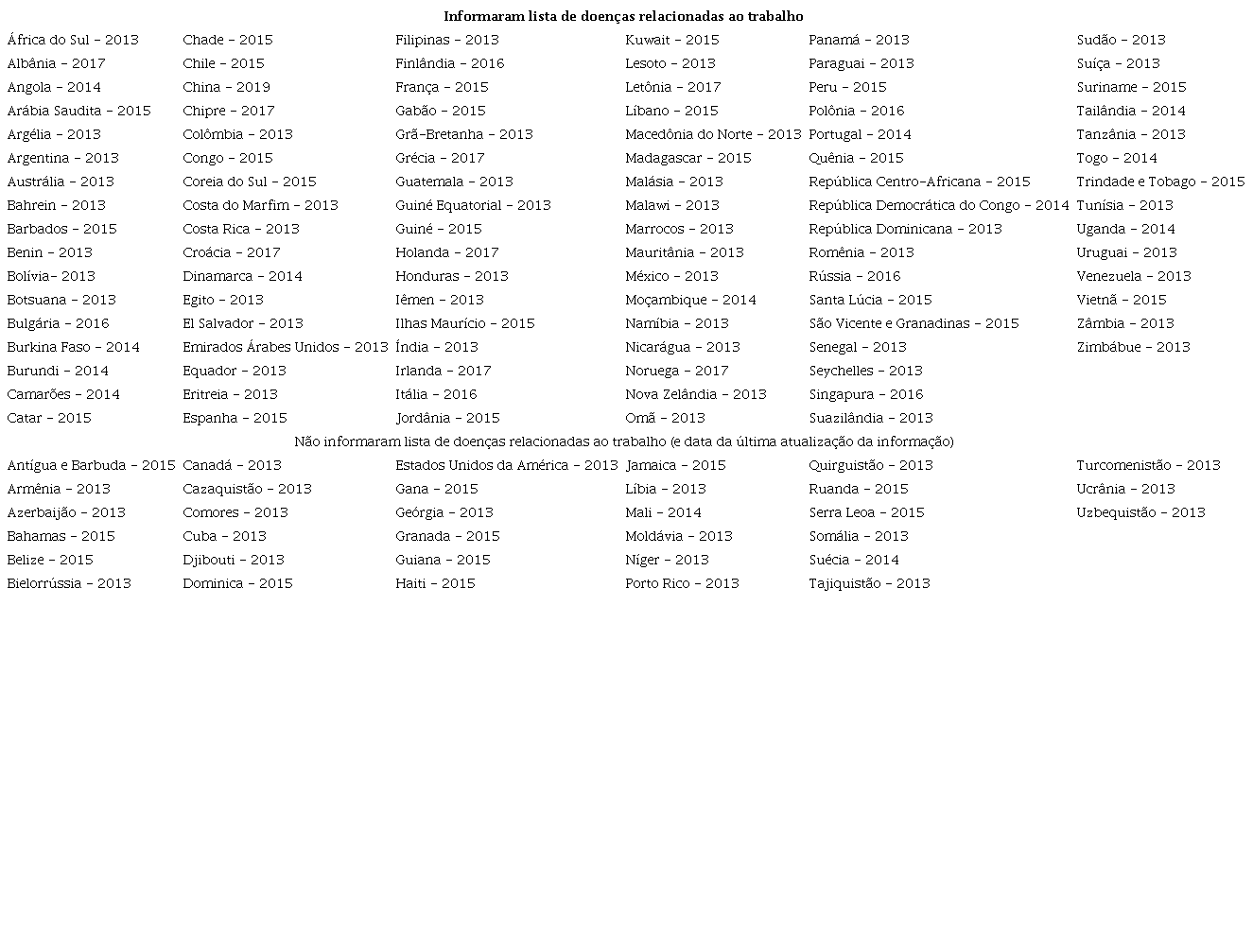 A versão mais recente da lista da OIT foi publicada em 2010, após um processo de revisão que durou oito anos e teve duas oficinas com especialistas. As discussões envolveram representantes governamentais, representações dos empregadores e dos trabalhadores. Naquela ocasião, foram analisadas e discutidas as listas de 30 países de quatro continentes4), (6. Informações obtidas em agosto de 2019 no sítio eletrônico da OIT relacionavam 99 países indicando marcos legais em Segurança e Saúde no Trabalho, incluindo uma LDRT oficial14) (Quadro 1).