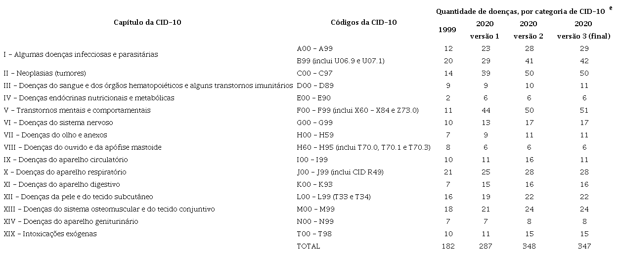 A Tabela 1 apresenta a evolução comparativa entre a versão de 1999 e a primeira versão da atualização da lista. Partiu-se de um total de 182 categorias (letra e dois números) da CID-10, e houve um aumento para 287 categorias, principalmente referente ao Capítulo II (Neoplasias [tumores]) e ao Capítulo V (Transtornos Mentais e Comportamentais).