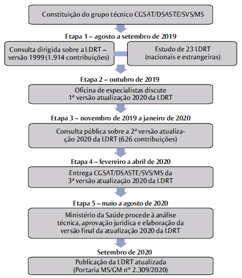 Resultados: na Etapa 1, a LDRT de 1999 foi comparada a outras listas internacionais e estrangeiras e foram consultados profissionais que fazem uso da lista brasileira. Na Etapa 2, organizou-se uma oficina de trabalho para discutir sobre a primeira versão da atualização. A Etapa 3 envolveu a análise das discussões da oficina de trabalho, a elaboração da segunda versão da atualização e a disponibilização para consulta pública. Na Etapa 4, após a análise das contribuições da consulta pública, elaborou-se a terceira versão, que foi encaminhada para análise governamental. A Etapa 5 consistiu na publicação da legislação com a atualização de 2020 da LDRT.