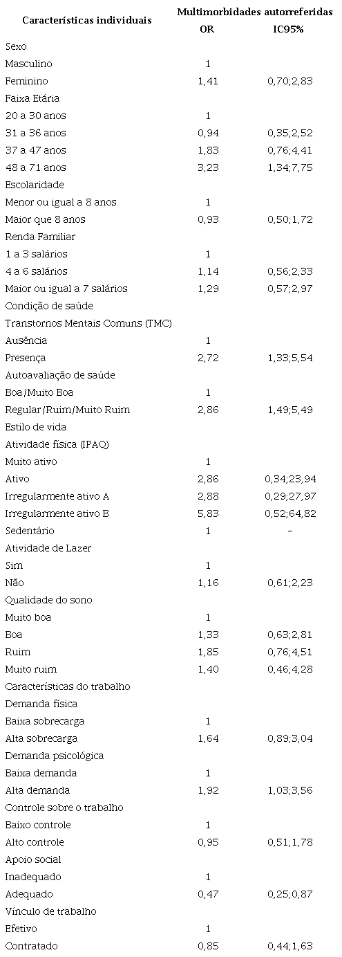 Results: 203 of the 257 eligible workers participated in this research, 144 women and 59 men. The most prevalent morbidities were: overweight (27.0%), hypertension (17.2%) and depression/stress (16.2%). The presence of multimorbidities (28.6%) was significantly associated to age over 48 years old (odds ratio - OR: 4,28; confidence interval of 95% - 95%CI: 1.66;11.04), to the presence of common mental disorders (OR: 3.23; 95%CI: 1.50;6.96), whereas the adequate social support at work remained as a protection factor (OR: 0.25; 95%CI: 0.11;0.57).