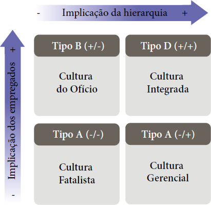 As dinâmicas envolvidas na criação, manutenção ou modificação de uma CS dependem fundamentalmente do grau de engajamento das lideranças e dos executantes nas propostas e práticas a favor da segurança5. Em função dessas relações, quatro tipos de cultura de segurança podem surgir: fatalista, de ofício, gerencial e integrada (Figura 1).
