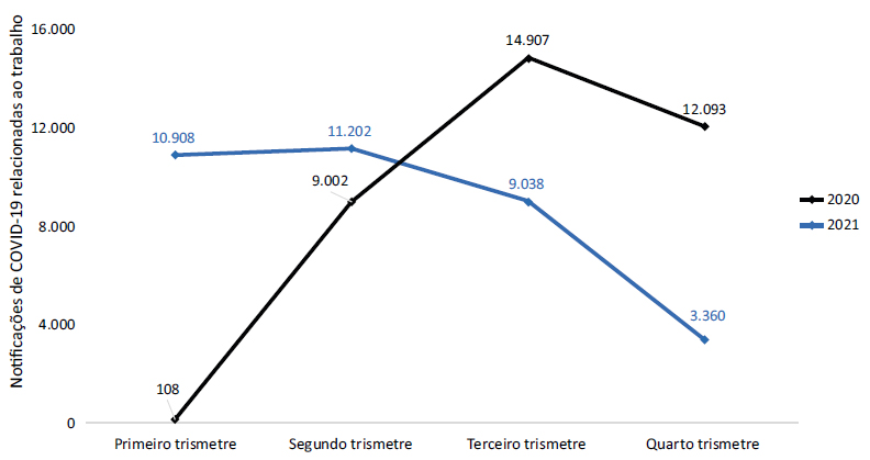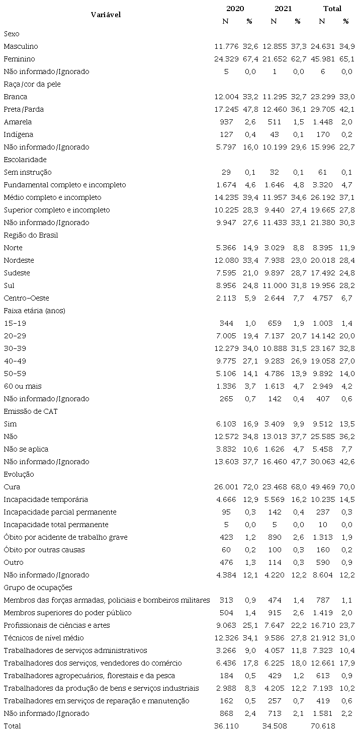 Results: in the years 2020 and 2021, a total of 36,110 and 34,508 work-related COVID-19 cases were reported, respectively. Considering both years, there was a higher frequency of notifications for female individuals (65.1%), black and mixed-race (42.1%), from the age group 30 to 39 years (32.8%). The Northeast region accounted for 28.4% of the reported cases. Work Accident Report (CAT) was issued in 13.5% of the reported cases, with a high percentage of missing information for this variable (42.6%). Middle-level technicians (31.0%) and professionals in sciences and the arts (23.7%) accounted for most notifications. Cure was the most prevalent outcome in both years (2020: 72.0%; 2021: 68.0%).