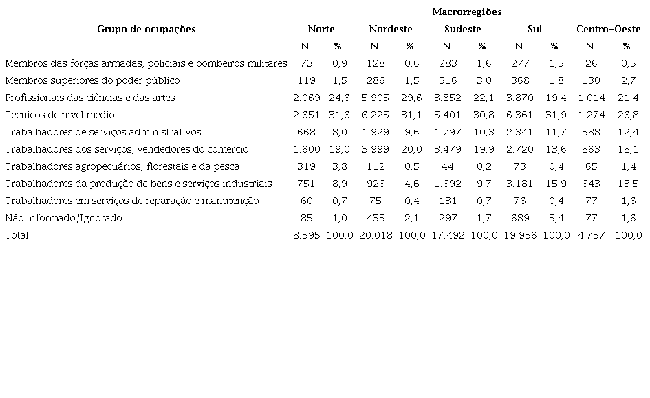O grupo ocupacional que concentrou a maior frequência de notificações, em todas as macrorregiões, foi o dos técnicos de nível médio, com cerca de 30% das notificações. Os profissionais das ciências e das artes apresentaram 29,6% de notificações no Nordeste e 19,4% na região Sul. Os trabalhadores dos serviços e vendedores do comércio foram o terceiro grupo mais acometido em todas as regiões, apresentando 20% de notificações na região Nordeste (Tabela 2).