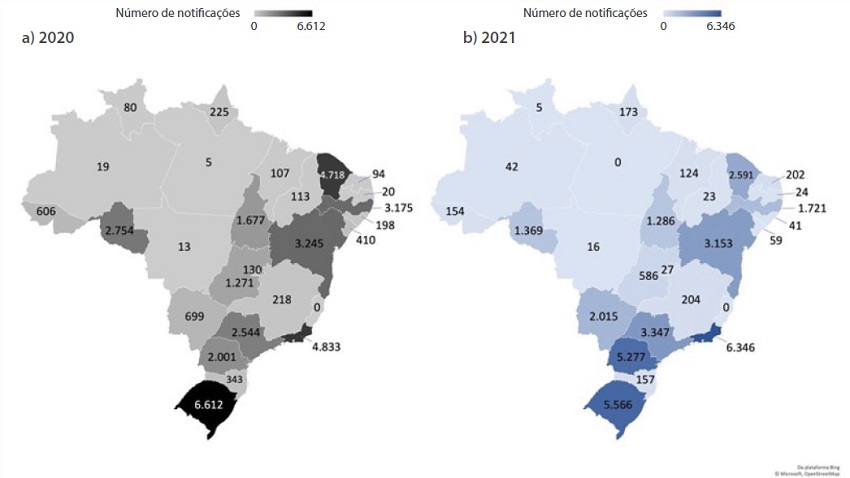 A Figura 2 apresenta as notificações de COVID-19 relacionada ao trabalho segundo unidades da federação. Em 2020, o estado do Rio Grande do Sul foi responsável por 18,3% das notificações do país, seguido do Rio de Janeiro (13,4%) e do Ceará (13,0%). Em 2021, o estado do Rio de Janeiro assumiu a liderança das notificações no Brasil (18,4%), seguido do Rio Grande do Sul (16,1%) e do Paraná (15,3%). Nos dois períodos, o estado do Espírito Santo não registrou notificações no Sinan (Figura 2).