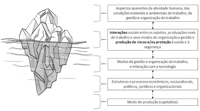 A metáfora do iceberg pode ser didaticamente útil para a compreensão de que os riscos psicossociais não devem ser “substancializados” e nem pensados como elementos autônomos, ou seja, vinculados apenas aos indivíduos e dissociados dos processos sociais observados em diferentes níveis de profundidade.