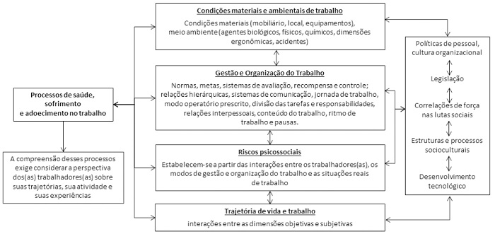 À medida que consideramos as experiências dos trabalhadores em situações reais de trabalho, podemos identificar as diferentes mediações que intervêm sobre os processos de saúde e de adoecimento7), (10, conforme ilustrado pela Figura 2: