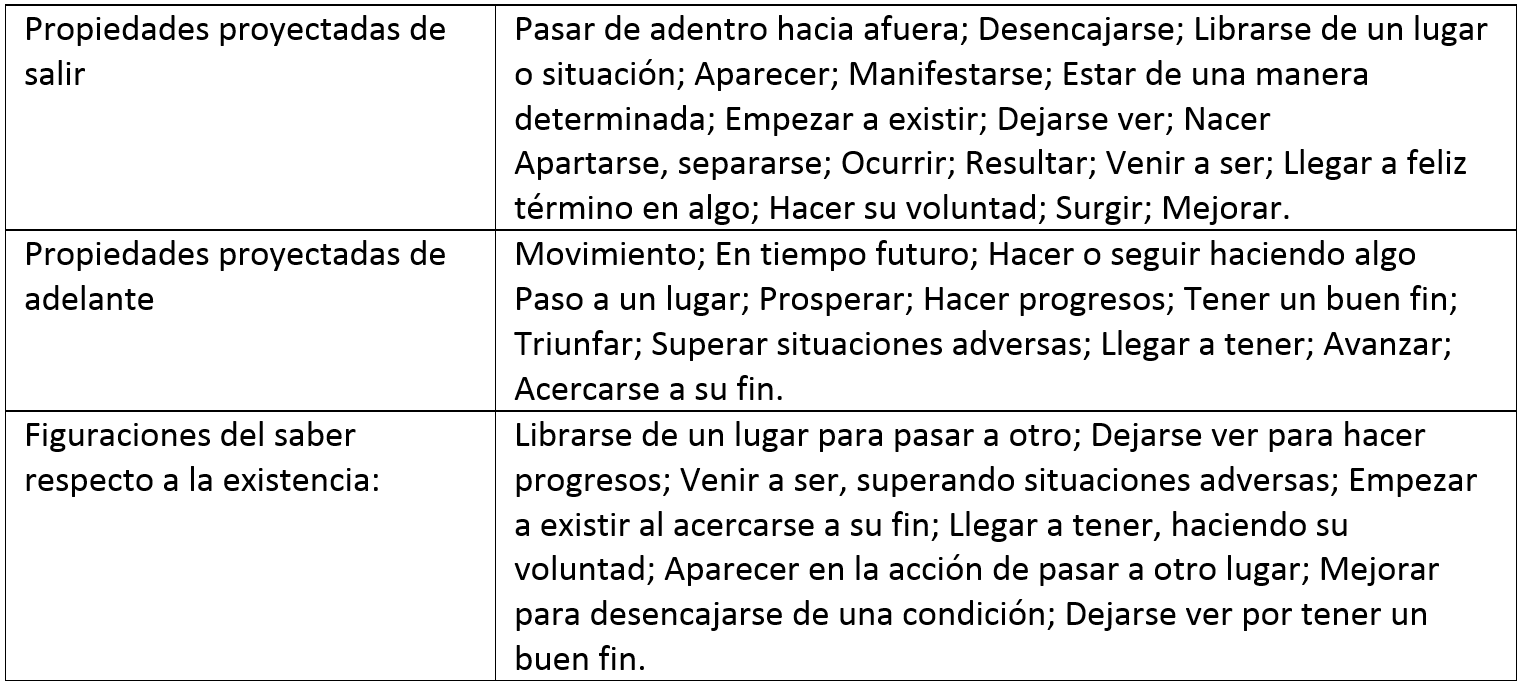 Esta tabla expone el ejercicio de dar cuenta hacia donde podríamos orientar el análisis del tropo, haciendo referencia a un sentido que esta fuera de sí, y que solo al descubrir el significado de los elementos que lo componen, se podría acceder al saber relacionado con la existencia. Por tanto, se intenta desvelar el lazo que une el sentido literal con el simbólico, en el entendido que las propiedades proyectadas de los términos que componen el tropo le otorgan un énfasis particular que solo en la trama de cada relato se puede reconocer. Con esto, dicho relato adquiere, a su vez, un sentido en el marco sociocultural e histórico en que se construye, quedando claro que se requiere realizar un mapeo permanente y selectivo entre dominios, pues cada una de las propiedades alumbran algunos aspectos de la experiencia y esconden otros. Lo importante es poner en movimiento el principio de relevancia, es decir, el re-conocimiento del contexto para definir las proyecciones más verosímiles.