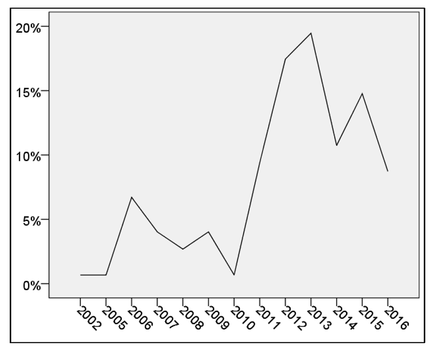 Por su parte, la Figura 1 muestra el porcentaje de textos según año de publicación, evidenciándose un aumento importante de la producción asociado a los periodos álgidos de protestas estudiantiles: los años 2006 y 2011.