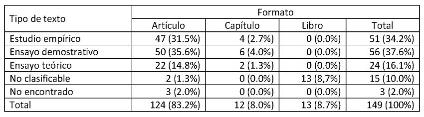 En la tabla 1 se presentan los resultados respecto del formato del documento (artículo, capítulo de libro o libro) y el tipo de texto (investigación empírica, ensayo teórico, ensayo demostrativo, no clasificable o no encontrado). Puede observarse claramente que el formato predominante es el artículo de revista científica y que el tipo de texto dominante es el ensayo, aunque con una presencia importante de estudios empíricos. La mayoría de los estudios empíricos son cualitativos (39 estudios, casi el 83%), seguidos por los mixtos (9 estudios, 19.1%) y una muy pequeña proporción de estudios puramente cuantitativos (3 estudios, 6.4%).