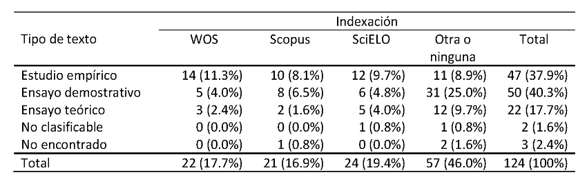 En la tabla 2 se muestra la indexación más selectiva que posee cada artículo de revista (considerando el mayor nivel de selectividad WOS, luego Scopus y finalmente SciELO). Puede observarse que la mayoría de los artículos son publicados en revistas indexadas. Sin embargo, un porcentaje no menor (46%) está publicado en revistas no indexadas o indexadas en bases poco selectivas. Por otro lado, se observa una asociación entre el tipo de texto y su indexación, siendo mayor la proporción de estudios empíricos que se publican en bases selectivas.