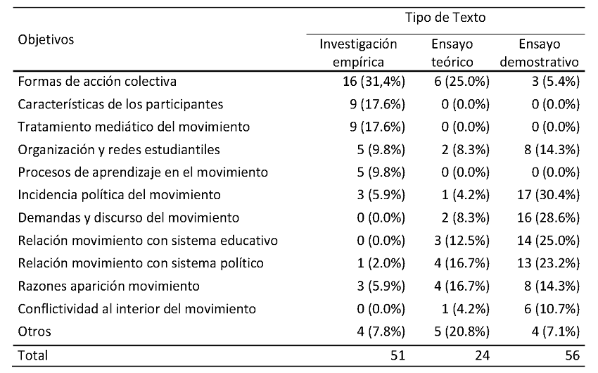 Objetivos: meta principal en el caso de los textos empíricos y argumento central en el caso de los ensayos. Responde a la pregunta: ¿qué le interesa al autor conocer o analizar sobre el movimiento estudiantil?