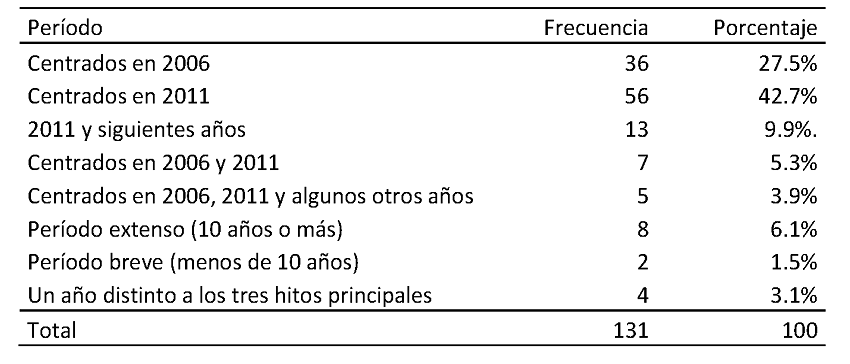 Respecto al período de tiempo que se analiza en el texto, la Tabla 4 muestra que la gran mayoría de los documentos se centran en los eventos ocurridos en los años 2006 y 2011, sus consecuencias y/o antecedentes (el 89.3% de los estudios caen en esta categoría gruesa). El año 2001 en cambio, que también es considerado un hito en el movimiento, es apenas abordado.