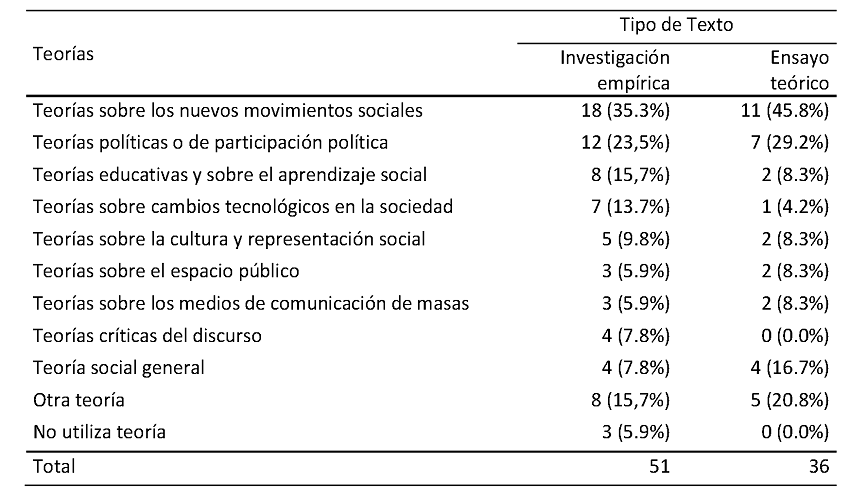 Como muestra la tabla 5 , se aprecia un predominio de teorías de nuevos movimientos sociales y teorías políticas o de la participación política, tanto en los ensayos teóricos como en las investigaciones empíricas. Sin embargo, las investigaciones empíricas tienden a ser un poco más diversas en sus enfoques teóricos que los ensayos teóricos.
