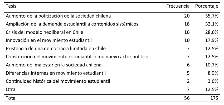 Aunque a primera vista esta tabla pareciera reflejar una alta heterogeneidad en las tesis sostenidas por los autores, una mirada más detenida muestra que estas tesis pueden agruparse en solo dos grandes ideas. Por una parte, que la sociedad chilena ha sufrido importantes transformaciones, experimentando profundos cambios en su sentir y expresión política (las categorías: “aumento de la politización de la sociedad chilena”, “crisis del modelo neoliberal en Chile” y “aumento del malestar en la sociedad chilena”, agrupan tesis desarrolladas por el 75% de los estudios); y por otra, que el movimiento estudiantil ha experimentado grandes cambios, tanto a nivel de sus demandas como de sus formas de organización (las categorías “ampliación de la demanda estudiantil a contenidos sistémicos” y “constitución del movimiento estudiantil como nuevo actor político” agrupan tesis desarrolladas por el 44,6% de los estudios).